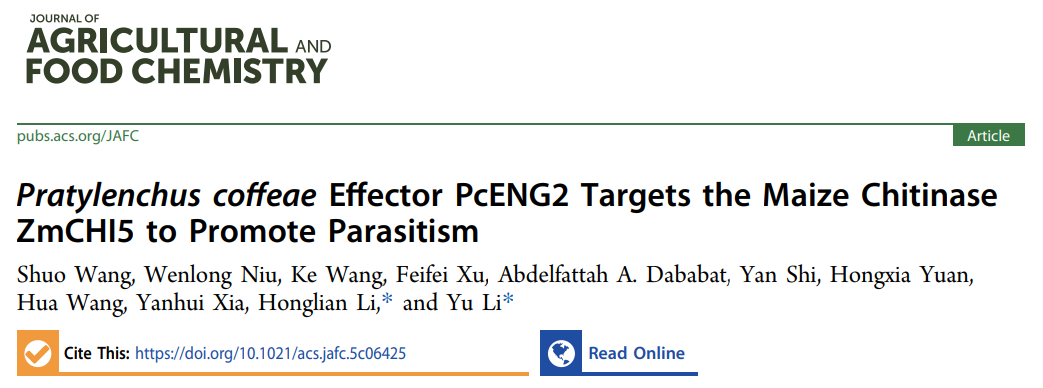 2025年10月15日,我院李洪连教授/李宇副教授课题组在中国科学院一区TOP期刊《Journal of Agricultural and Food Chemistry》发表了题为“Pratylenchus coffeae Effector PcENG2 Targets the Maize Chitinase ZmCHI5 to Promote Parasitism”的研究论文。该研究解析了咖啡短体线虫效应蛋白PcENG2通过靶向抑制玉米几丁质酶ZmCHI5活性,进而逃逸玉米免疫反应促进线虫寄生的分子机制。