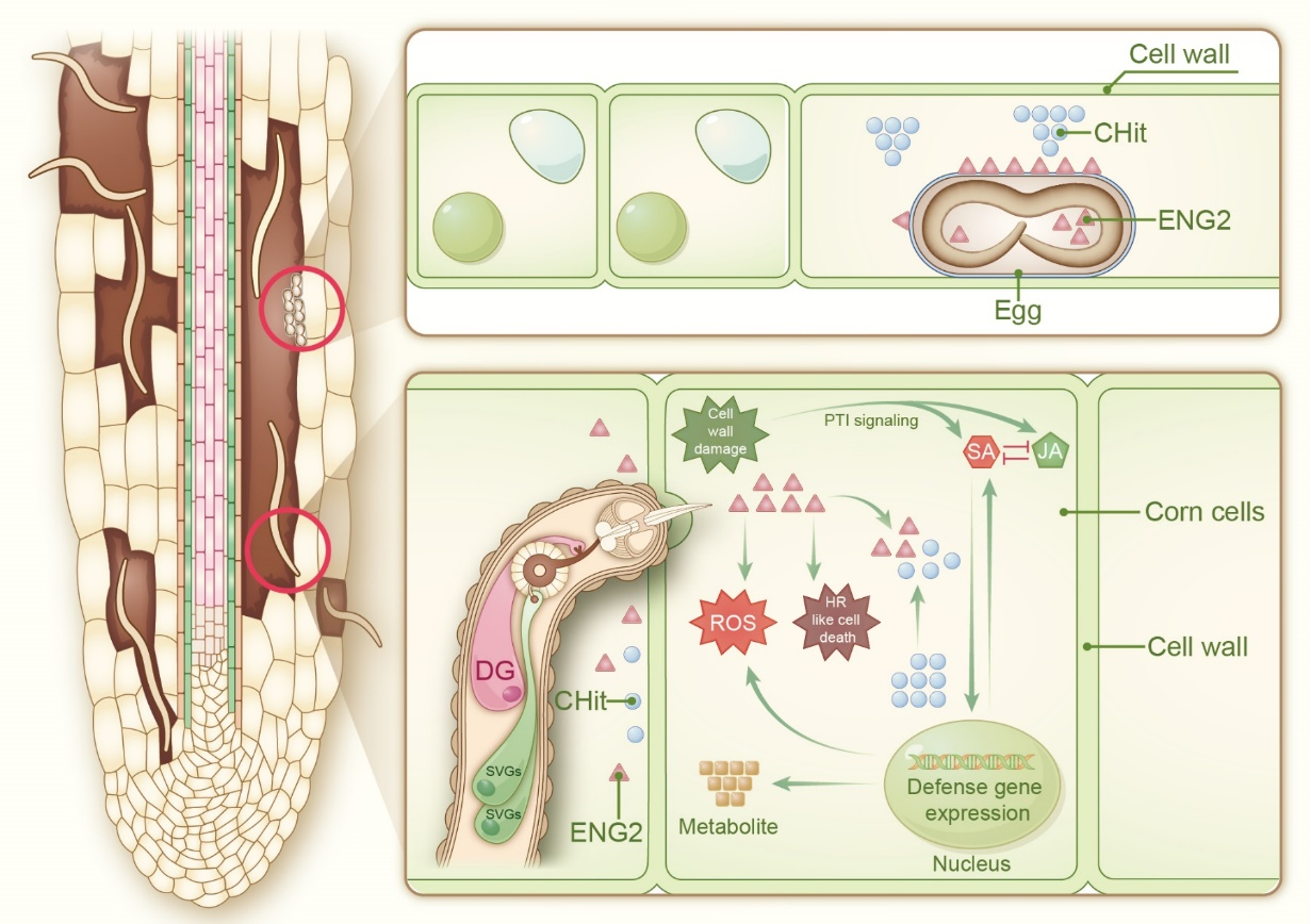玉米是我国重要的粮食作物,在农业生产中占据重要地位。短体线虫(Pratylenchus Flipjev, 1936)又称根腐线虫,是我国黄淮海地区玉米上分布最广危害最重的植物病原线虫。咖啡短体线虫(P. coffeae)是致病力最强的根腐线虫之一,在我国严重危害玉米、小麦、山药等多种粮食作物和经济作物。目前,关于根腐线虫调控寄主免疫反应促进侵染寄生的机制尚不明确。本研究以咖啡短体线虫为对象,通过原位杂交和免疫荧光定位证实特异表达于咖啡短体线虫食道腺的PcENG2在其侵染过程中被分泌到玉米根系组织,沿侵染通道作用于寄主细胞。此外,PcENG2能够直接与玉米几丁质酶ZmCHI5互作,通过调控ZmCHI5的活性从而抑制寄主ROS爆发、防御基因表达和细胞坏死等免疫反应,抑制其对线虫卵和体壁的降解,从而促进咖啡短体线虫的侵染寄生。该研究为深入了解玉米与根腐线虫互作机理及玉米根腐线虫病的绿色防控提供了新的理论依据。