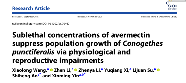 近日,我院尹新明教授/安世恒教授团队在昆虫学中科院一区TOP期刊《Pest Management Science》杂志在线发表了题为“Sublethal concentrations of avermectin suppress population growth of Conogethes punctiferalis via physiological and reproductive impairments”的研究论文。该研究系统评估了阿维菌素对桃蛀螟在繁殖能力、激素调控、解毒代谢及种群动态发生等多个方面的影响,为桃蛀螟的可持续综合防控提供了重要科学依据。