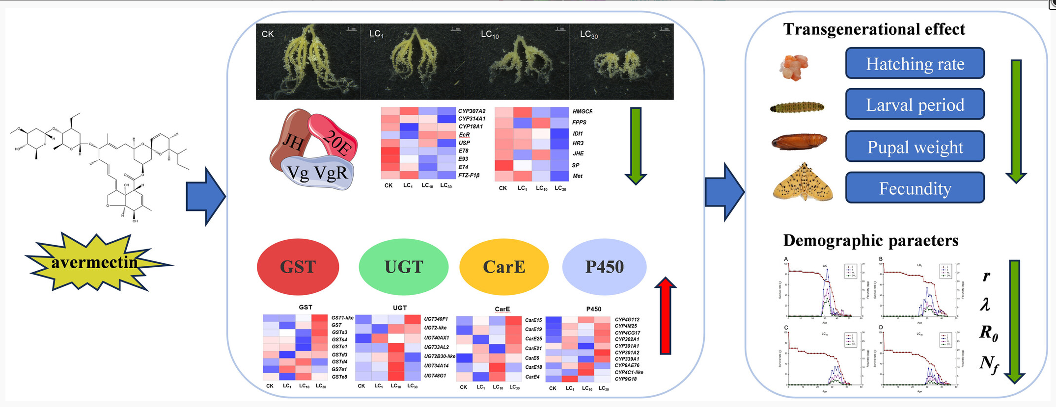 研究发现,亚致死浓度阿维菌素处理显著抑制了桃蛀螟F0代和F1代雌虫的生殖力和卵巢发育,并降低其体内蜕皮激素(20E)、保幼激素(JH)、卵黄原蛋白(Vg)及其受体(VgR)水平降低。此外,F1代卵孵化率下降,蛹重降低,成虫寿命缩短且繁殖力减弱。基于两性生命表的分析进一步显示,桃蛀螟种群内禀增长率(r)、周限增长率(λ)、净生殖率(R0)和生殖力(F)均显著降低,而总产卵前期(TPOP)和平均世代时间(T)延长。值得注意的是,亚致死浓度阿维菌素暴露还显著诱导了F0代和F1代羧酸酯酶(CarE)、细胞色素P450氧化酶(P450)、谷胱甘肽转移酶(GST)和尿苷二磷酸糖基转移酶(UGT)的活性和基因表达水平。该研究全面揭示了亚致死浓度阿维菌素对桃蛀螟生理和繁殖的抑制机制,为合理使用该药剂及制定可持续害虫治理策略提供了有价值的理论依据。