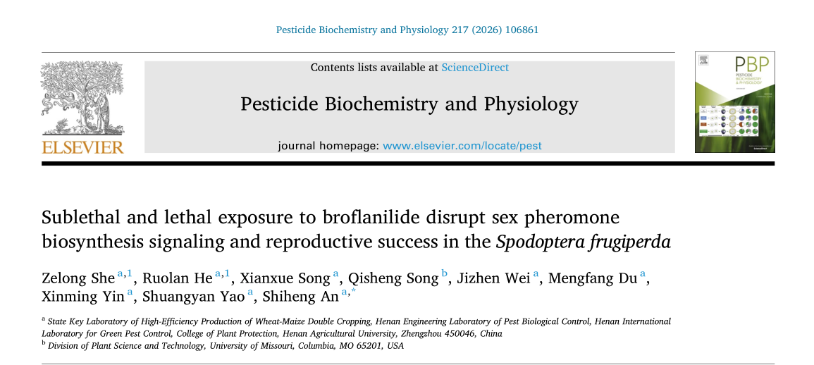 近期,我院安世恒教授团队在《Pesticide Biochemistry and Physiology》发表了题为“Sublethal and lethal exposure to brofanilide disrupt sex pheromone biosynthesis signaling and reproductive success in the Spodoptera frugiperda”的研究论文。该研究表明,溴虫氟苯双酰胺在亚致死和致死剂量下均会显著干扰草地贪夜蛾的性信息素合成信号通路,影响其繁殖成功率,为害虫管理提供了新的见解。