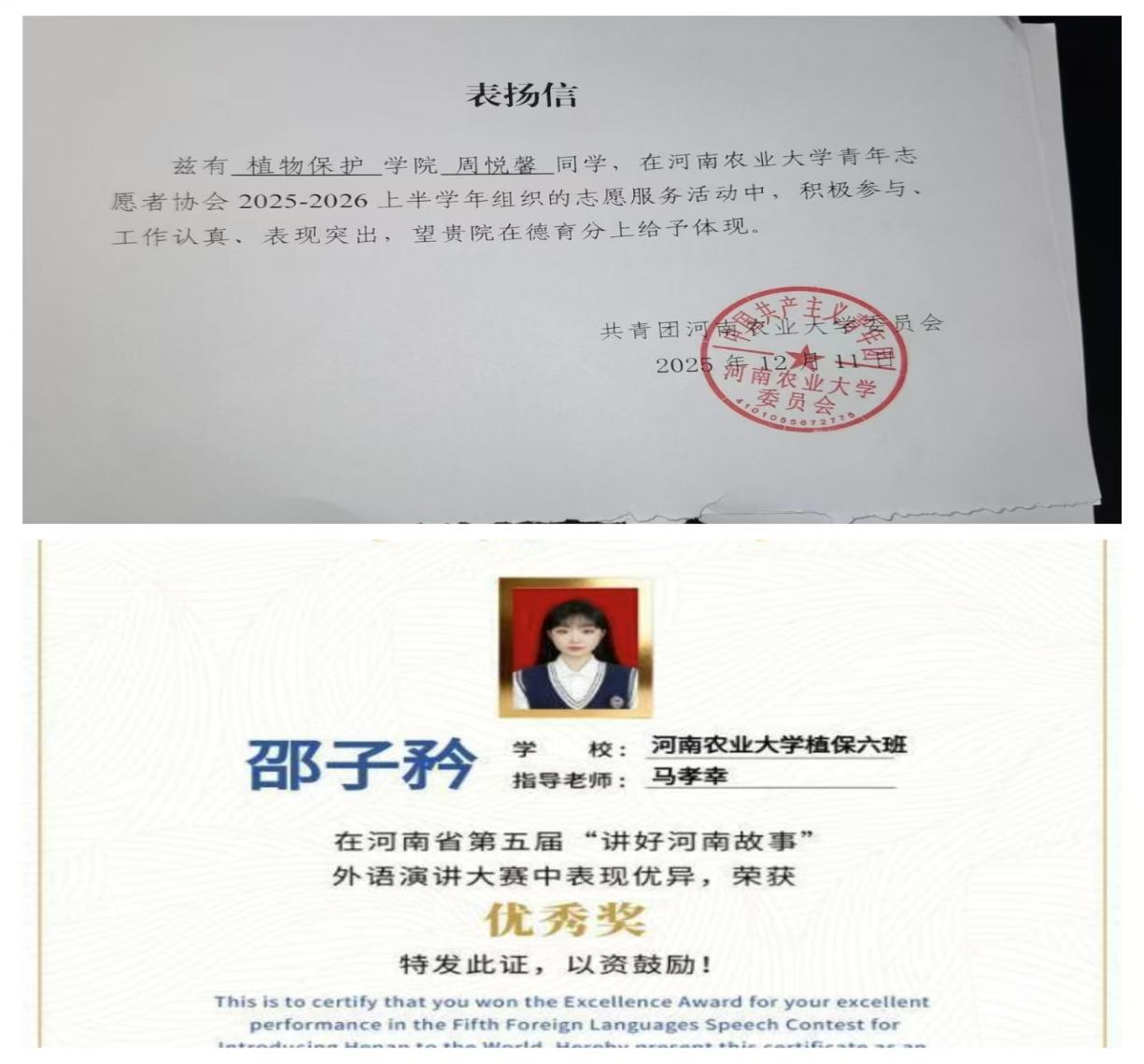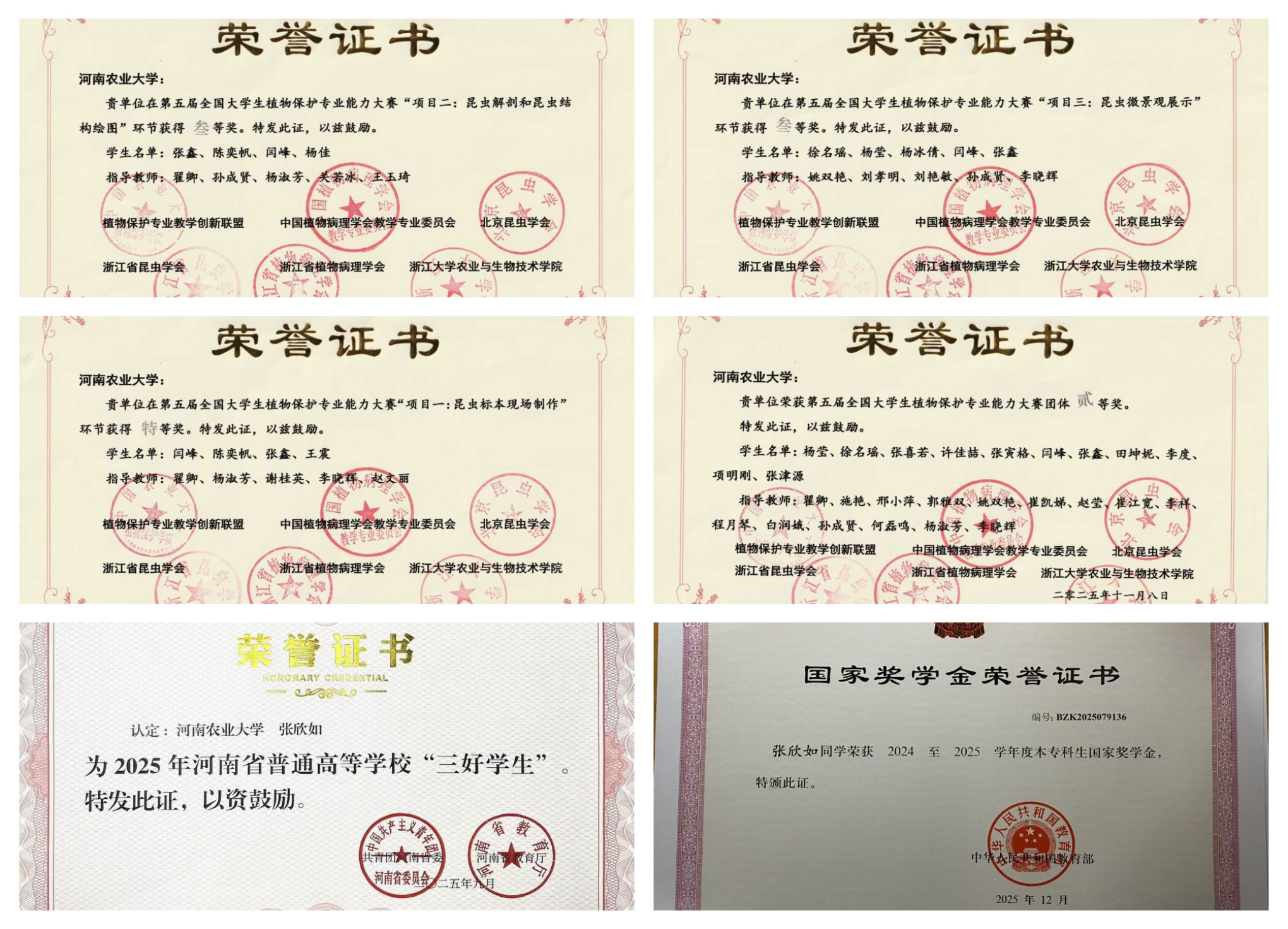 学习成绩斐然: 该班级学风浓厚,同学们刻苦钻研、认真听讲,班级平均学分绩点3.01,共有2人次荣获奖学金,8人次获得校级以上奖励,英语四级通过率达57%。其中1位同学获得国家奖学金,3人获得第五届“讲好河南故事”外语大赛省级优秀奖,1人获得植保技能大赛特等奖,在各类学业相关竞赛中斩获多项荣誉,展现出扎实的专业功底和勤学善思的良好风貌。