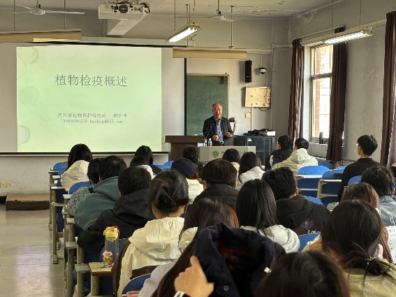 本网讯(通讯员 陈琳琳)新生入学,我院特邀植物检疫专家韩世平研究员,于2025年10月21日在桃东楼608教室为 2025级动植物检疫(植检)专业新生讲授专业导论课。 课上,韩世平研究员围绕植物检疫概述、植物检疫法规和植物检疫管理体制、国内农业植物检疫的基本制度和河南省农业植物检疫工作简介展开讲解,系统介绍了什么是植物检疫?为什么要进行植物检疫?怎么进行植物检疫?