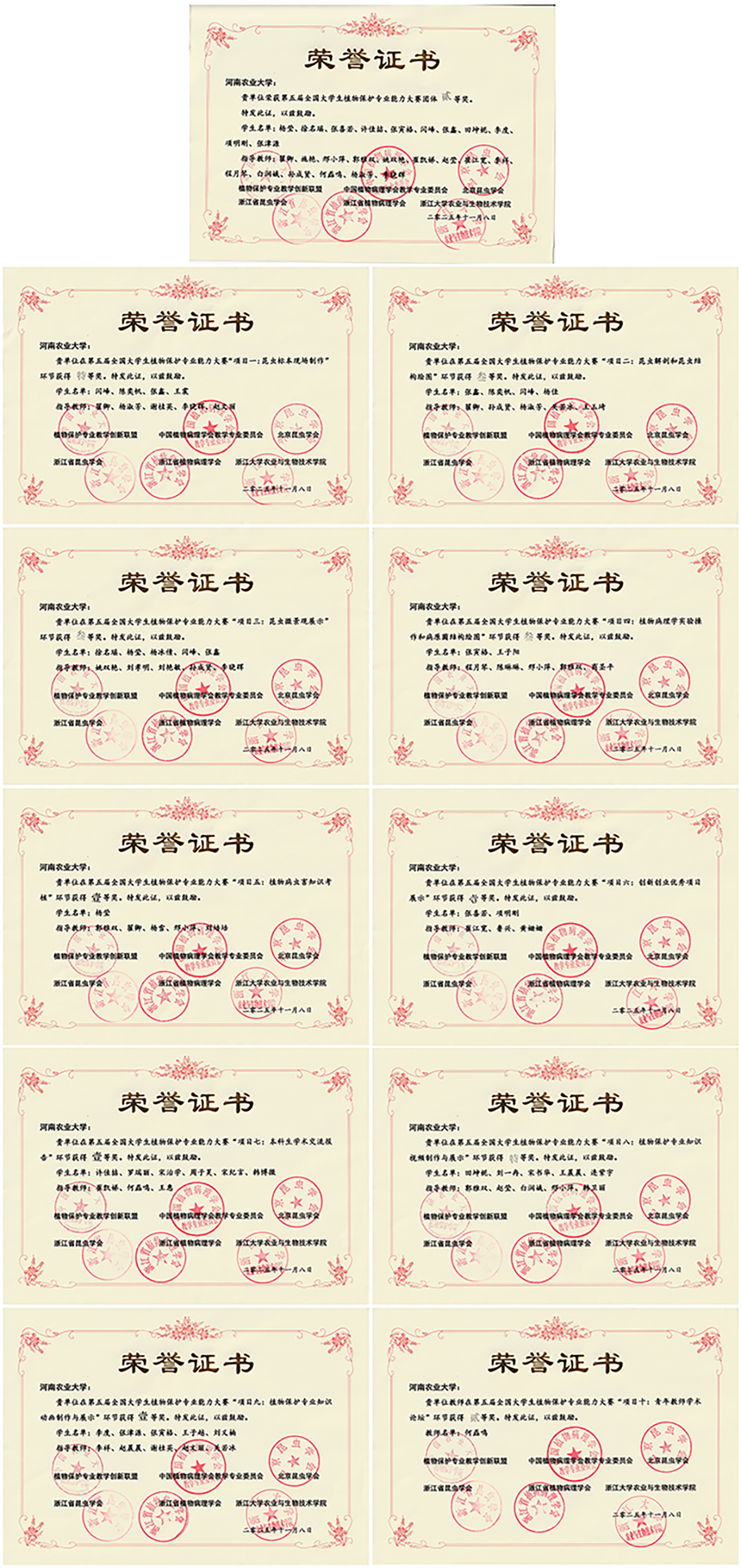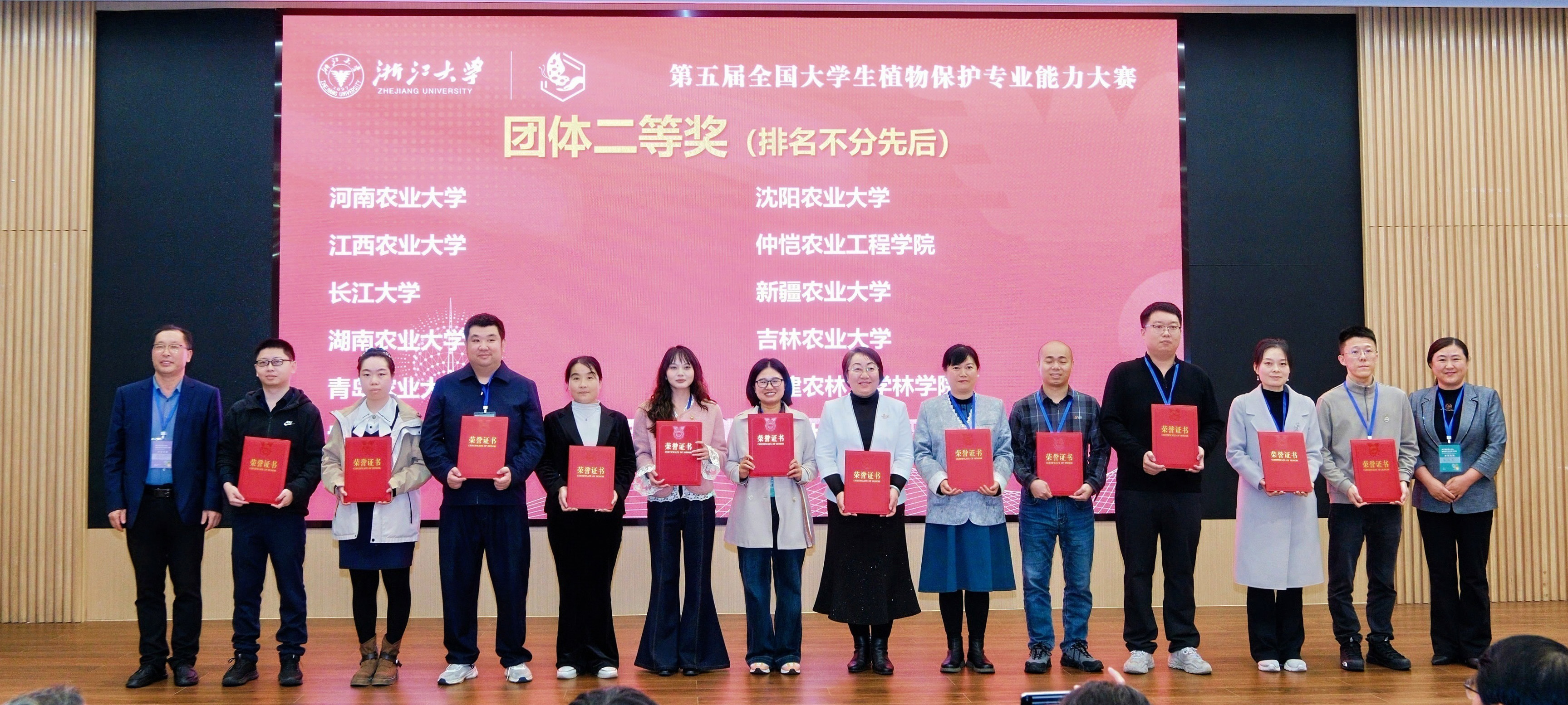 本网讯(通讯员 翟卿 李祥 图片 翟卿)11月8日,第五届全国大学生植物保护专业能力大赛在浙江大学紫金港校区圆满落幕。本届大赛以“智护丰稔,慧育生机”为主题,吸引了全国47所涉农高校代表队同台竞技。经过激烈角逐,我院师生凭借扎实的专业素养和出色的实践能力,斩获团体二等奖,并在单项比赛中表现优异,共获得特等奖2项、一等奖4项、二等奖1项及三等奖3项。