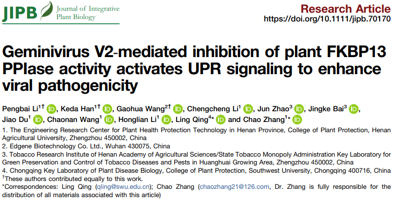近日,我院李洪连教授/张超教授团队与西南大学青玲教授合作,在国际权威期刊《Journal of Integrative Plant Biology》上发表了题为“Geminivirus V2-mediated inhibition of plant FKBP13 PPIase activity activates UPR signaling to enhance viral pathogenicity”的研究论文。该研究揭示了双生病毒编码的V2蛋白通过特异性抑制寄主蛋白NbFKBP13的折叠功能激活UPR,进而促进病毒侵染和症状形成的分子机制。这些发现为理解植物-病毒协同进化中的"军备竞赛"提供了新的理论依据。