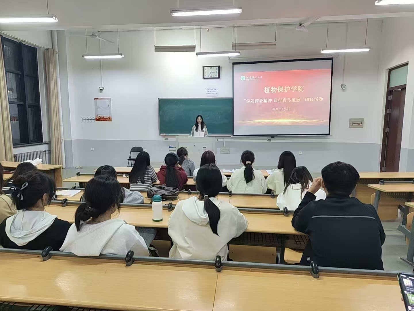 之后,班长屠洪瑞领学两会精神。她结合政府工作报告中“全面推进乡村振兴”的重点内容,选取农业科技推广、青年返乡创业等典型案例资料,通过“政策原文与案例分析”的方式,引导同学们逐段研读。